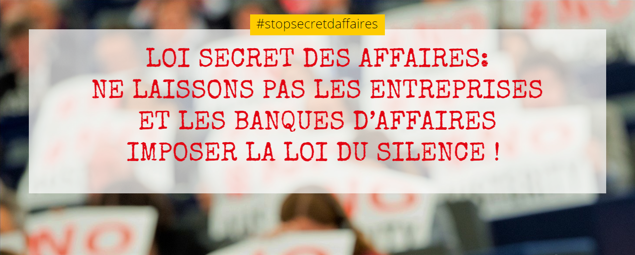 D’ici 24h, si rien n’est fait, les députés français vont voter la loi du silence sur les Secrets d’affaires qui leur a été transmise directement par Bruxelles – où elle a été élaborée, main dans la main, avec les lobbies des plus grandes banques d’affaires, laboratoires pharmaceutiques et industrie agrochimique.